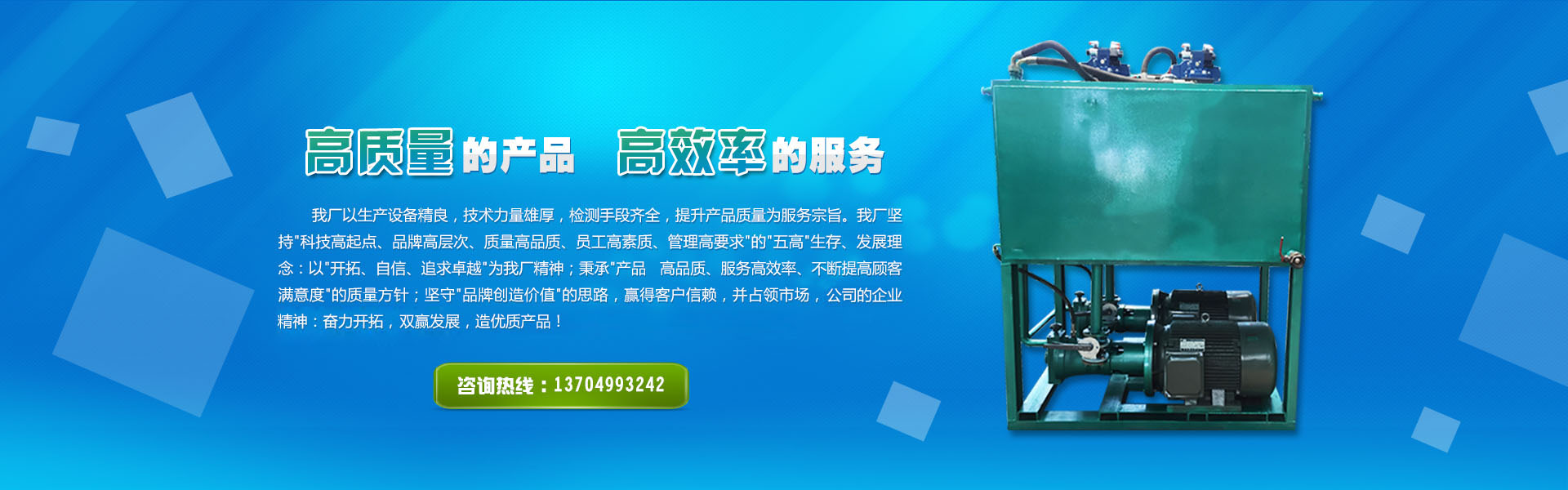 我廠堅持科技高起點、品牌高層次、質(zhì)量高品質(zhì)、員工高素質(zhì)、管理高要求的"五高"生存、發(fā)展理念,以"開拓、自信、追求卓越"為我廠精神。